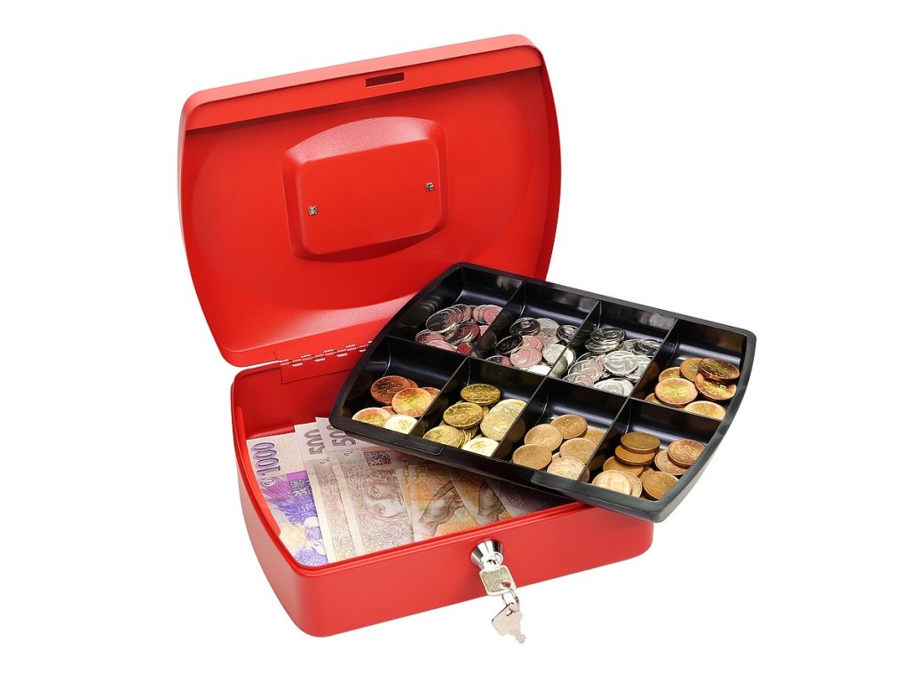 - ocelová pokladnička s vyjímatelnou plastovou vložku na mince