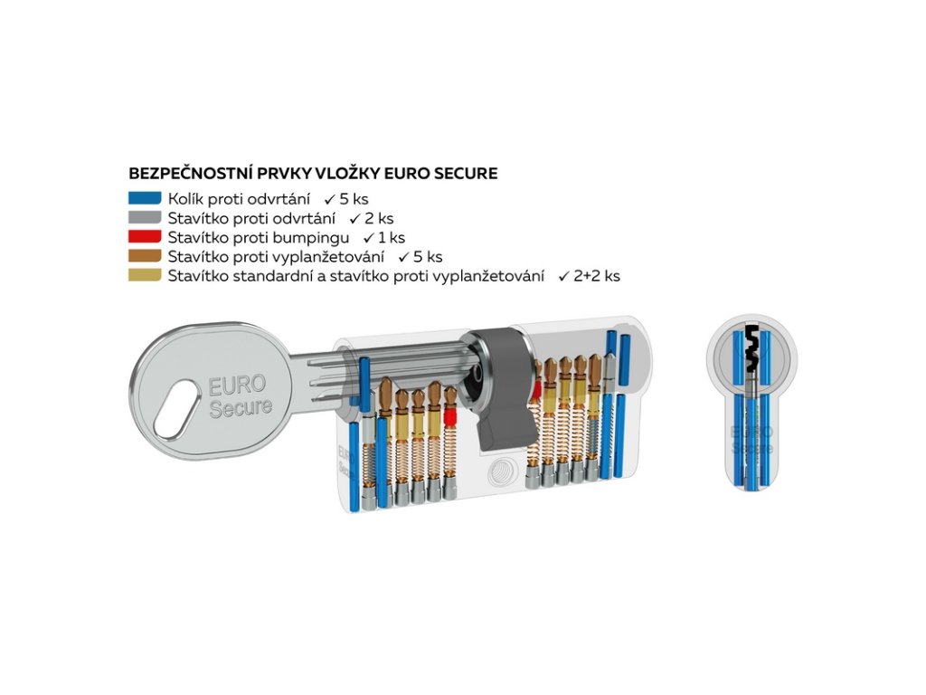 - ochrana proti odvrtání pomocí 6 prvků z kalené oceli, které tvoří 5 kolíků a 1 stavítko